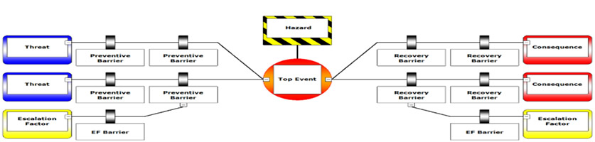 Metodologia destinada a identificar potenciais modos de falha para um produto ou processo, avaliar o risco associado a esses modos de falha, classificar os problemas em termos de importância e identificar e executar ações corretivas para tratar das preocupações mais sérias. Identifica ameaças e perigos. Perguntas sobre o que poderia dar errado? e sobre o que aconteceria se as coisas derem errado. Este tipo de análise é uma atividade de brainstorming e é realizada por pessoas que têm conhecimento sobre as áreas, operações e processos que podem ser expostos a eventos e condições perigosos. O Método BowTie é um diagrama que permite visualizar o risco ao qual se esta enfrentando de uma perspectiva única e fácil entendimento. O diagrama tem a forma de una gravata borboleta, criando una clara distinção entre a gestão dos riscos com controles preventivos e reativos. O poder do diagrama BowTie é entregar uma visão geral dos múltiplas cenários possíveis em uma só imagem. Permitindo ao mesmo tempo definir controles e suas formas de monitoramento. Técnica de análise da criticidade de trabalhos de manutenção e montagens, com base no número de pessoas expostas e o tipo de risco a que elas se expõe. Aplica-se durante o planejamento de trabalhos de Paradas de Manutenção ou de Novos Projetos.What-if